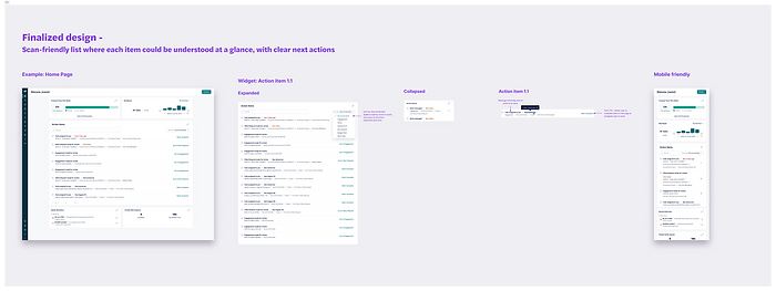 I partnered closely with our product trio — myself (Design), our PM, and our Tech Lead — to define the high-level solution. We kept engineering looped in early, incorporating their feedback on feasibility. Sales wanted an early screenshot for their decks, so I ensured our designs were polished enough to support external storytelling. Other designers and leadership were kept in sync, since this widget sits at the heart of the Home experience.​​